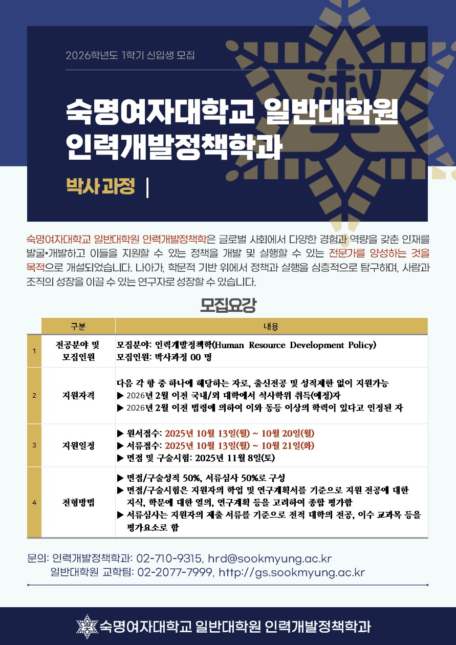 2026학년도 전기 숙명여자대학교 일반대학원 인력개발정책학과 박사과정 신입생 모집