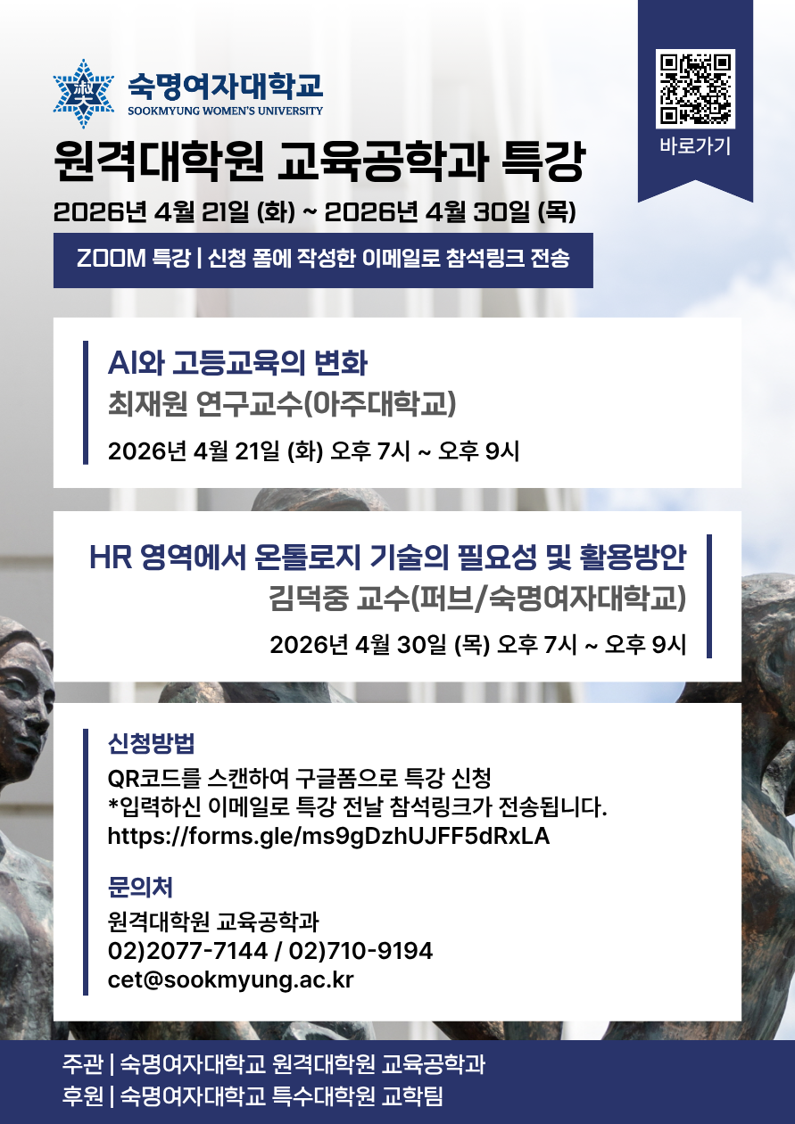 [특강] 숙명여자대학교 교육공학과 2026년 4월 Zoom 특강 <AI와 고등교육 변화 및 HR 영역에서 온톨로지 기술의 필요성 및 활용방안> 개최 및 신청 안내